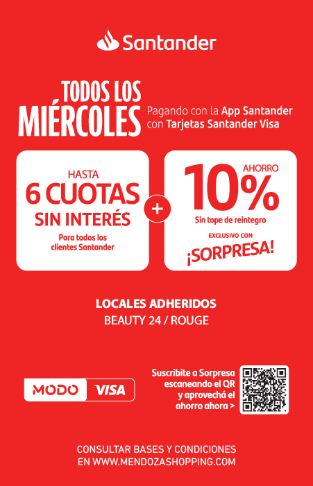 VÁLIDA LOS DÍAS MIÉRCOLES, DEL 25/03/2026 AL 24/06/2026 (CON EXCEPCIÓN DEL 17/06/2026), EN LOS LOCALES ADHERIDOS, ABONANDO CON QR A TRAVÉS DE LA APP SANTANDER O APP MODO CON TARJETAS SANTANDER VISA CRÉDITO Y/O DÉBITO. SE EXCLUYEN COMPRAS ABONADAS POR TRANSFERENCIAS O PAGOS REALIZADOS CON DINERO EN CUENTA, A TRAVÉS DE BILLETERAS VIRTUALES O FINANCIADAS POR PROGRAMAS CUOTA A CUOTA. NO ACUMULABLE CON OTRAS PROMOCIONES. VÁLIDO ÚNICAMENTE PARA CLIENTES TITULARES DE CUENTA BANCARIA SANTANDER. EN CASO QUE LA COMPRA SEA REALIZADA CON UNA TARJETA ADICIONAL, EL REINTEGRO SE VERÁ REFLEJADO EN LA CUENTA BANCARIA DEL TITULAR. NO ACUMULABLE CON OTRAS PROMOCIONES. EL AHORRO ES EXCLUSIVO PARA CLIENTES SUSCRIPTOS AL PROGRAMA SORPRESA SANTANDER. LA COMISIÓN POR MEMBRESÍA MENSUAL SORPRESA SANTANDER SERÁ DEBITADA DE LA CUENTA O TARJETA DE CRÉDITO DEL CLIENTE, EL QUINTO DÍA HÁBIL DEL MES, CONOCER PRECIO VIGENTE EN: WWW.SANTANDER.COM.AR/PERSONAS/BENEFICIOS/SORPRESA. EL AHORRO SE HARÁ EFECTIVO VÍA REINTEGRO DENTRO DE LOS 30 DÍAS DE EFECTUADO EL CONSUMO EN LA CUENTA BANCARIA TITULAR DEL CLIENTE. EJEMPLO: EN UNA COMPRA CON TARJETA DE CRÉDITO DE $120.000, EN 6 CUOTAS: REGISTRARÁ UN REINTEGRO DE $12.000 EN LA CUENTA BANCARIA TITULAR, Y DEL PRIMER AL SEXTO RESUMEN DE LA TARJETA DE CRÉDITO UN CONSUMO DE $20.000 EN CADA UNO. LOS ACCIONISTAS DE BANCO SANTANDER ARGENTINA S.A. NO RESPONDEN EN EXCESO DE SU INTEGRACIÓN ACCIONARIA.